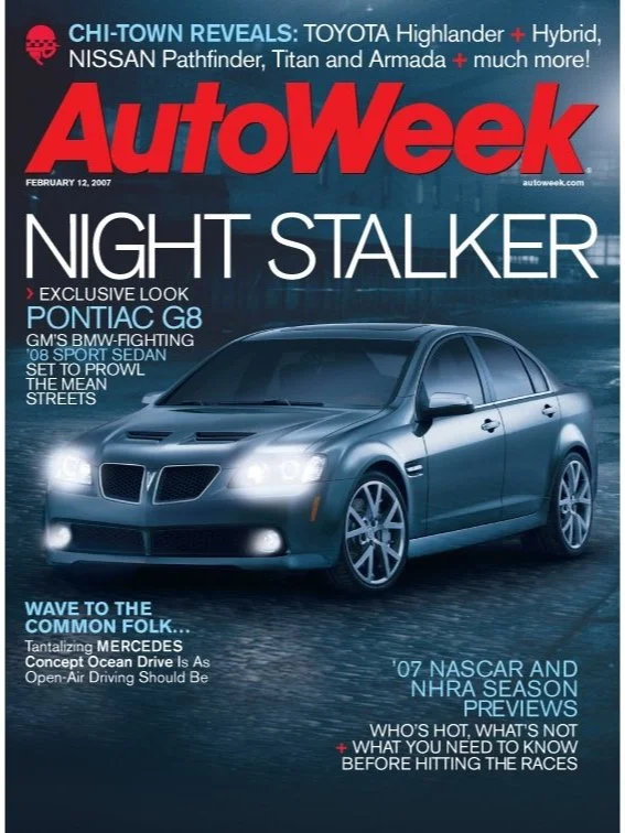 Kay Elizabeth developed the concept, design and headline for Auto Week magazine’s cover, “Night Stalker”, featuring the powerful Pontiac G8 as a stealthy animal shot at night for Brophy Marketing Services.