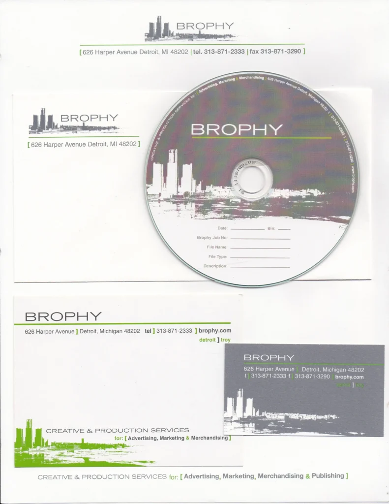 Corporate Identity Redesign : Kay Elizabeth redesigned Brophy’s Corporate Identity twice over the course of several years. This first redesign incorporated the iconic Detroit skyline.Brophy