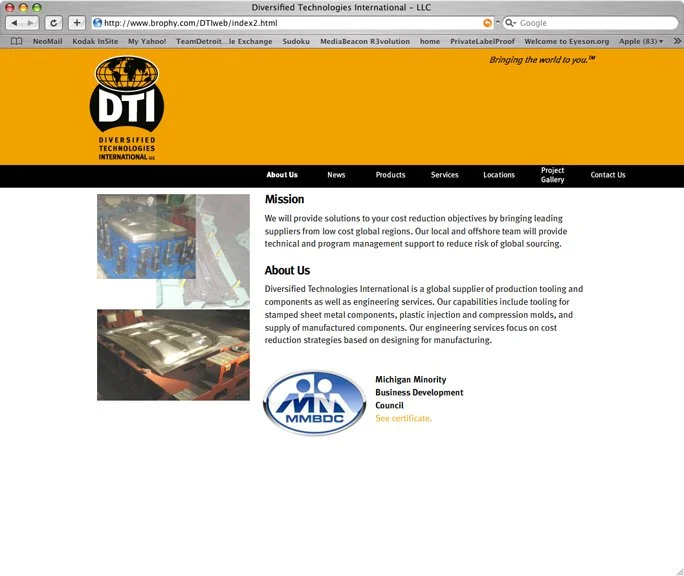 Diversified Technologies International, a global supplier of production tooling, components and engineering services needed a brand identity as well as corporate identity materials and a website. Kay Elizabeth designed a logo that reflected their global reach, as well as corporate identity and branding materials and a website that command attention with bold black and gold. Kay Elizabeth acquired this client for Brophy Marketing Services.