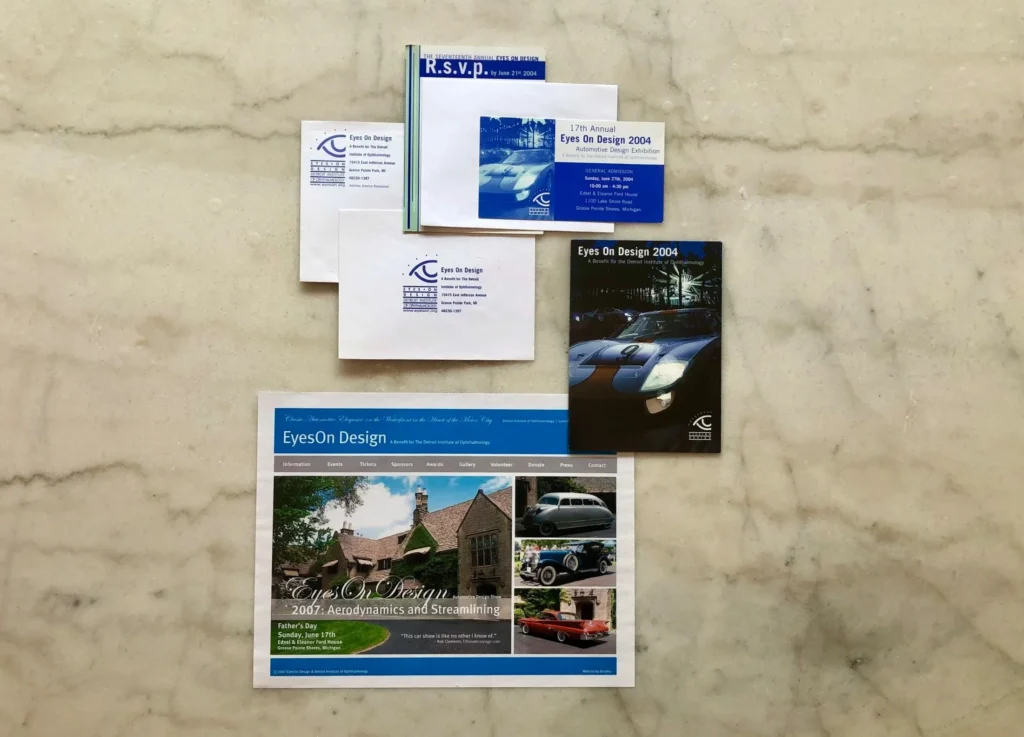 As a client of Brophy, Kay Elizabeth was responsible for designing and producing all of the marketing materials for the DIO’s annual Eyes On Design Car Show. Kay Elizabeth updated the EOD logo and designed everything from program books, posters, signage to tickets and website design that incorporated the featured annual automotive artist.