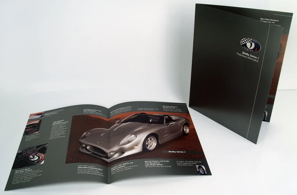 Carroll Shelby’s Series One was designed to be a street racing car. Kay Elizabeth was asked to design the brochure to introduce and launch the Series One. Using silver metallic stock reflecting the Series One’s metallic paint, the brochure elegantly reflected this iconic brand with its signature cobra logo and clean lines. Kay Elizabeth’s role is mentioned in the account of Carroll Shelby’s storied racing history, Snake Bit, by Eric Davison.